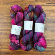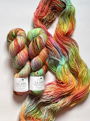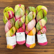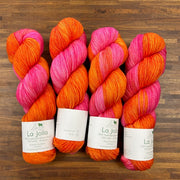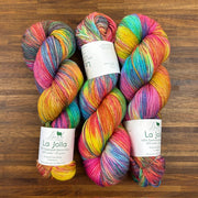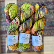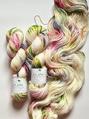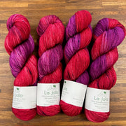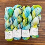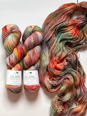 La Jolla, Baah Yarn’s most popular and sought-after product is a fingering weight yarn, made of 100% superwash merino wool. Each unique skein of Baah Yarn La Jolla is carefully hand painted in small batches in their Las Vegas studio, using only high-quality yarn and professional grade dyes. As with all hand-dyed yarns, each skein takes on a slightly different appearance (even when dyed together!) No two will look identical, which makes each skein unique!